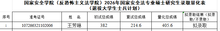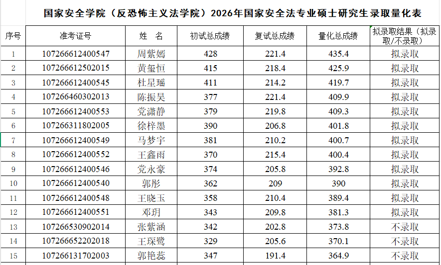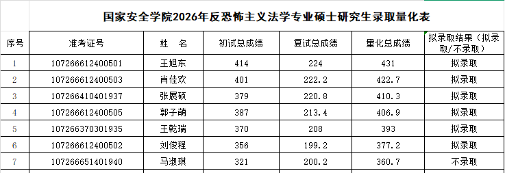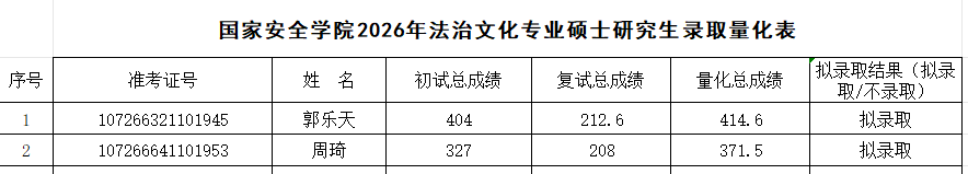 根据《西北政法大学2026年硕士研究生复试录取工作方案》,经皇冠体育投注复试领导小组审核,报研究生院审定,现将2026年国家安全法学专业、反恐怖主义法学专业和法治文化专业硕士研究生拟录取名单予以公示,公示期7日(3月31日至4月6日)。如有异议,请在公示期内申请复议,逾期不予受理。